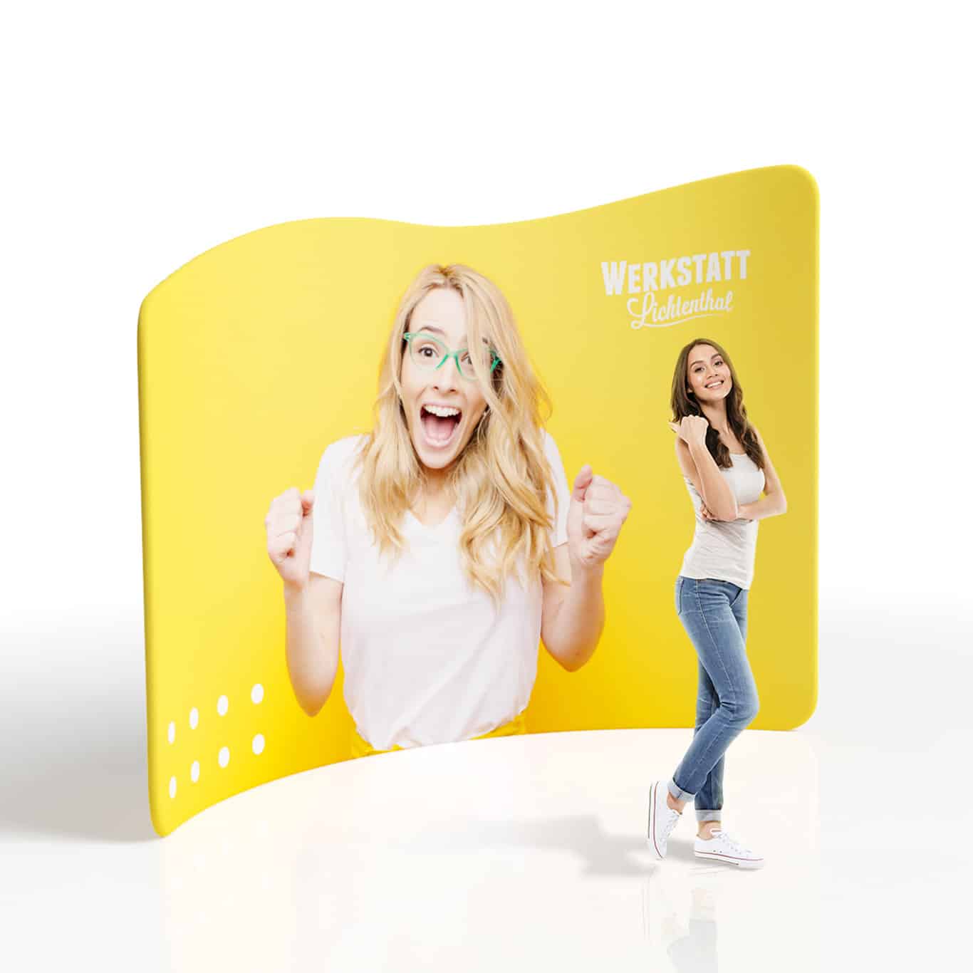 Durch das Sublimationsdruckverfahren auf Hot Stretch Polyester leuchten die Farben und die Motive sind klar. Die Textilgrafik ist abnehmbar, waschbar und jederzeit austauschbar – ideal für wechselnde Kampagnen und nachhaltige Einsätze.